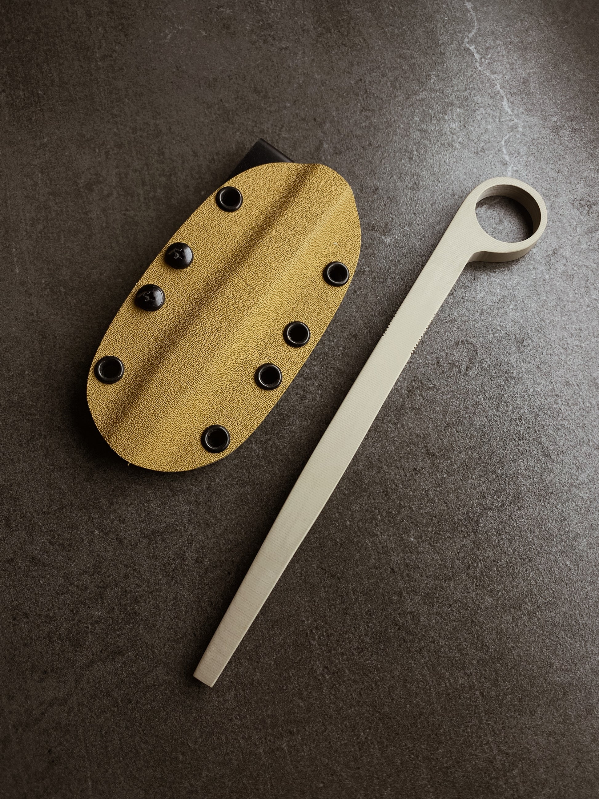 Tan G10 ringed pry bar with a kydex sheath. 215mm long, 15mm wide, 8mm thick and a 24mm finger hole. This tool was designed for everyday prying, whether that is opening drink cans, prying off car interior trim pieces or even switching off electrical outlets. Designed as safety tool with the looks of a tool for your everyday carry.